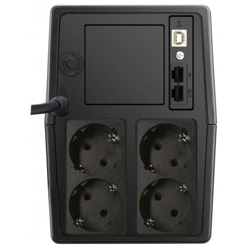 Capacitate: 1000 VA / 600 W UPS line interactive cu management prin port USB Control eficient al microprocesorului AVR pentru stabilizarea tensiunii (Boost and Buck) Repornire automata la revenirea curentului in retea Forma de unda (Mod Baterie): Unda sinusoidala simulata Incarcare in modul oprit Tip baterie si numarul bateriilor incluse: 12 V / 7 Ah x 2 Functie de pornire la rece Autonomie de backup: 18 minute la 25% sarcina, 5 minute la 50% sarcina, Nu se recomanda utilizarea la 100% sarcina pe termen lung. Interfata: – Retea: cablu de alimentare Schuko – LCD – Conectori de iesire: Schuko x 4 – USB x 1 – Conector telefon/retea: RJ11/ RJ45 Dimensiuni compacte (D x W x H): 320 x 130 x 182 mm Greutate: 8.2 kg. Bateria are 12 luni garantie